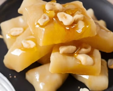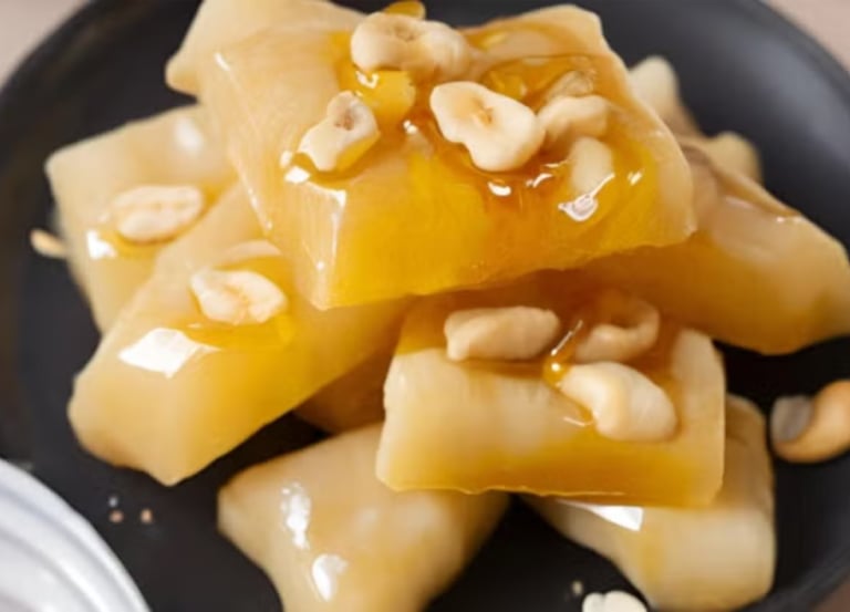 Cozinhe o aipim, regue com manteiga derretida e mel, e finalize com castanhas crocantes. Um equilíbrio perfeito entre o doce e o salgado.